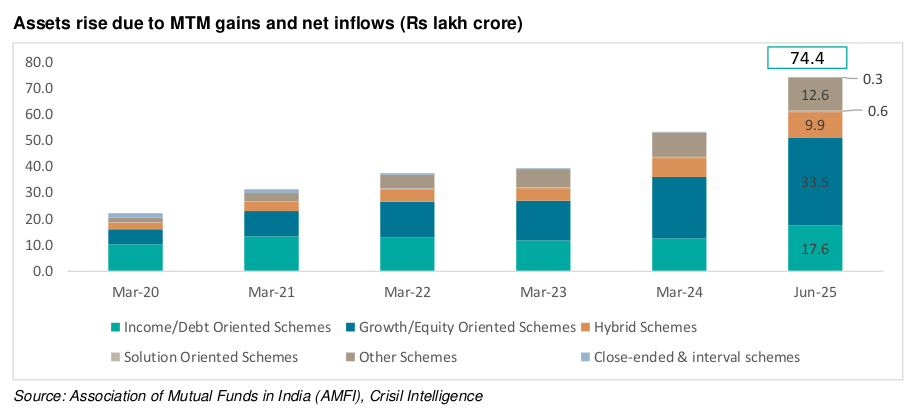 Between January and June, mutual fund assets under management (AUM) grew by over ₹7 lakh crore, from ₹67.25 lakh crore to ₹74.41 lakh crore—a growth of about 11%. This was driven mainly by the rise in the value of existing investments and fresh investments across categories. Overall, the mutual fund industry saw inflows of around ₹4.18 lakh crore during this period.