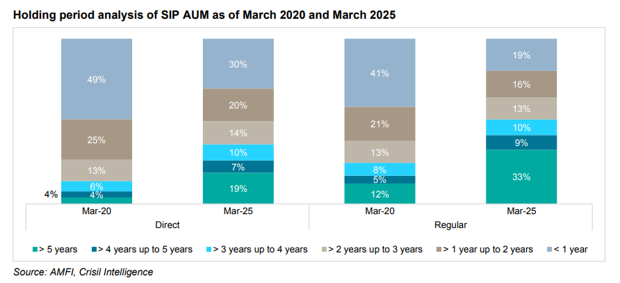 Regular plans still lead the way when it comes to long-term SIP discipline. As of March 2025, one in three SIPs in regular plans had been held for more than five years, up from just 12% in 2020. But direct plan investors are also catching up. The share of SIPs held for over five years in direct plans rose from 4% to 19%, and those held for less than a year dropped from 49% to 30%.