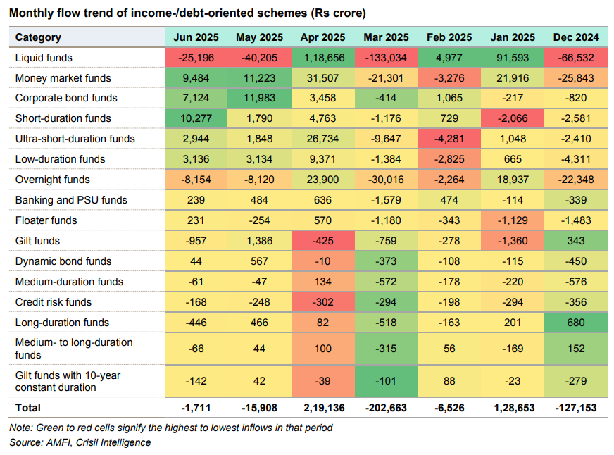 However, some categories are seeing good interest from the falling interest rate cycle. With the RBI cutting the repo rate by a full percentage point in 2025 so far, most recently to 5.5% in June, short-duration funds and corporate bond funds, which tend to benefit as rates decline, saw strong inflows of ₹10,277 crore and ₹7,124 crore in June. Meanwhile, overnight and ultra-short duration funds continued to see outflows as their relative returns become less attractive in a falling rate environment.