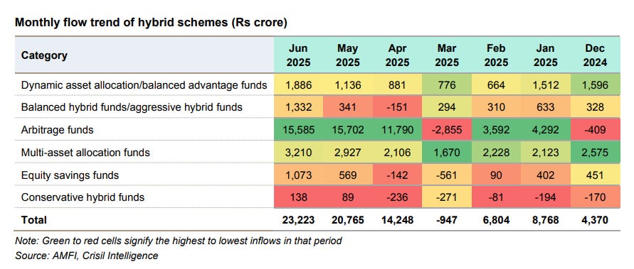 Flows in hybrid funds, on the other hand, have been steady and have increased from ₹4,370 crore in December 2024 to ₹23,223 crore in June 2025. Arbitrage funds are driving most of this growth, with ₹15,585 crore coming in June alone. These funds benefit from market volatility, earning returns from price differences in the cash and futures segments. With markets being choppy, they’ve become a preferred low-risk option for many investors.