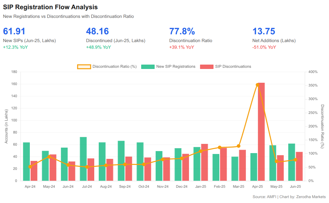 While SIP collections hit a record ₹27,269 crore in June 2025, the numbers beneath tell a different story. The discontinuation ratio has jumped from 58.7% in June 2024 to 77.8% in June 2025. Put simply, for every 100 new SIPs started, about 78 are being stopped or discontinued.