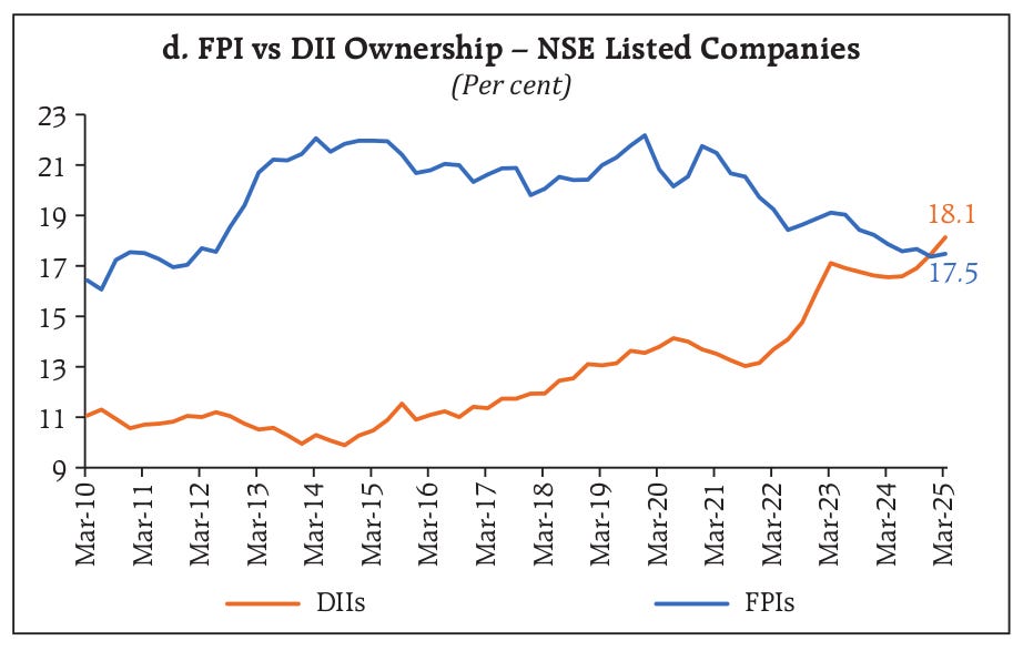 Here's something interesting: consistent inflows into mutual funds have boosted the share of Domestic Institutional Investors (DIIs) in Indian equities. DIIs now hold an 18.1% share, surpassing Foreign Institutional Investors (FIIs), who hold 17.5% as of March 2025.
