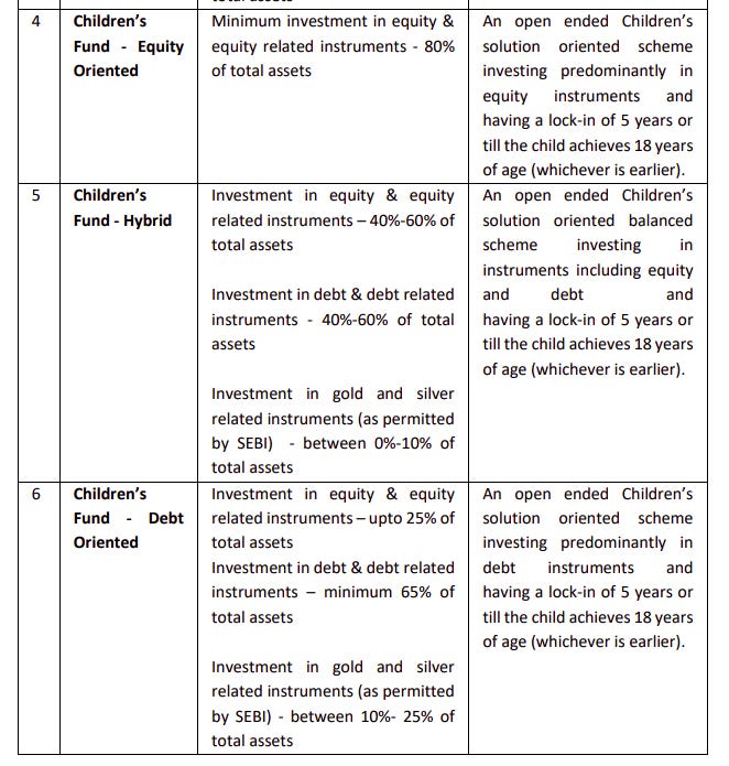 Multiple Variants for Goals: Typically, fund houses offer one retirement fund and one children’s fund. SEBI wants more diversity here; it wants mutual funds to offer different types of solution-oriented schemes, with varying mixes of equity and debt. For instance, if you’re investing for your children’s college education, your risk appetite may vary depending on how old your child is. So, SEBI’s creating categories like “Child Education Fund – Equity oriented” vs “Child Education – Hybrid”, letting you tailor the scheme to your risk appetite, without limiting goal-based funds to one template.