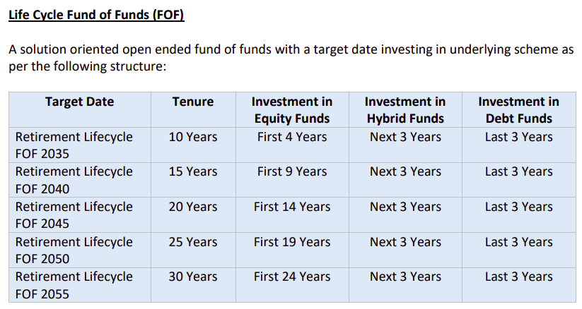 Suppose in 2025, you invest in a Retirement Life-cycle FoF 2040, because you're targeting retirement in 15 years. During the fund’s early years, the manager would likely allocate more heavily towards equity, aiming for better returns. Since your retirement is still far away, even if equity markets face temporary setbacks, you'd have enough time to recover and remain on track toward your goal. Then, as the target date gets closer, the manager would gradually shift more of your investment into hybrid funds, and ultimately into debt funds, to protect you from unexpected market shocks as your retirement date approaches.