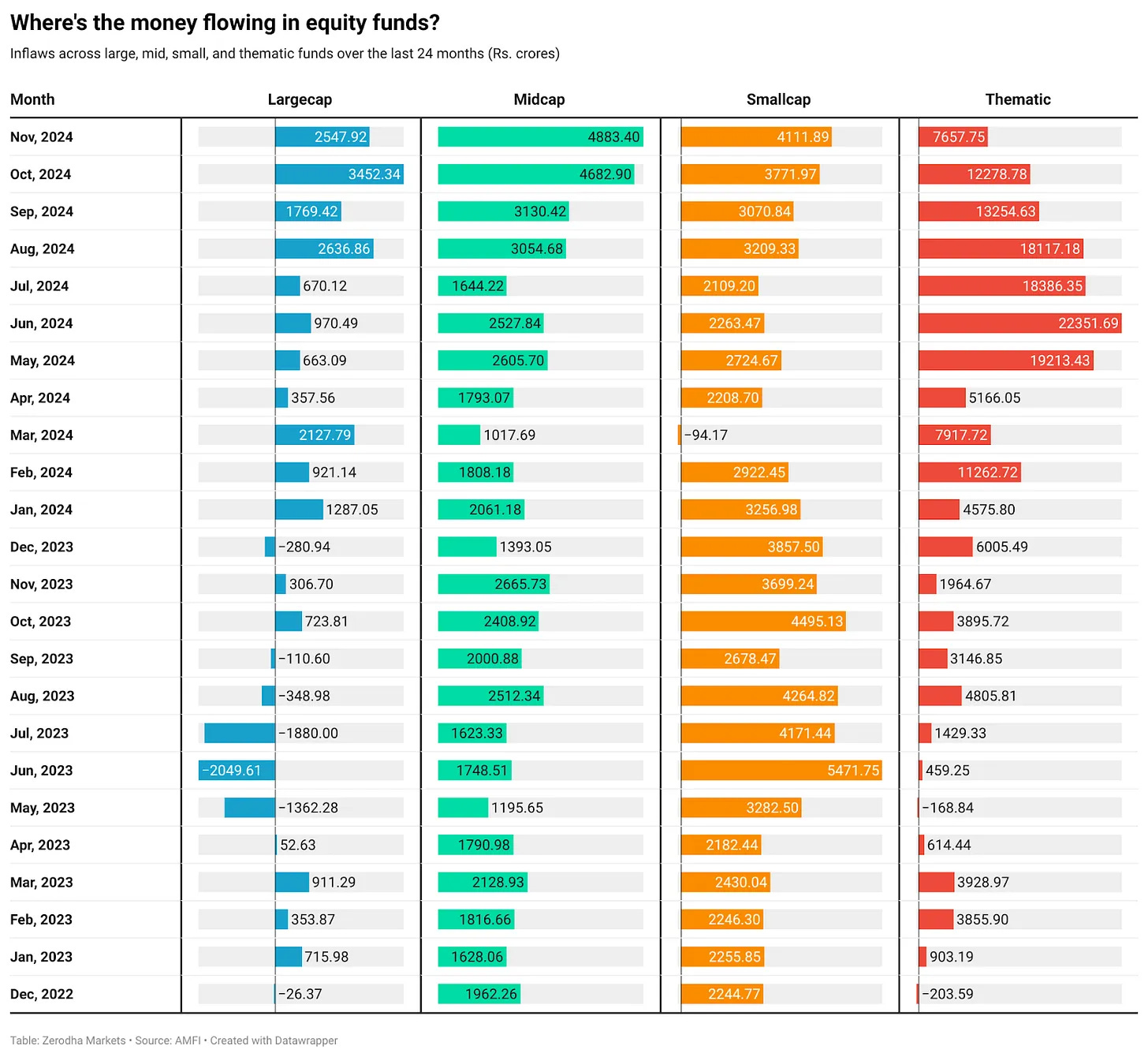 The numbers are mind-boggling. In 2023, total inflows into thematic funds were Rs. 30,840 crores. In 2024, it was more than four times as much, Rs. 1,40,132 crores. That’s insane! In fact, in 2024, thematic funds had more inflows than large, mid, and smallcap funds all put together!