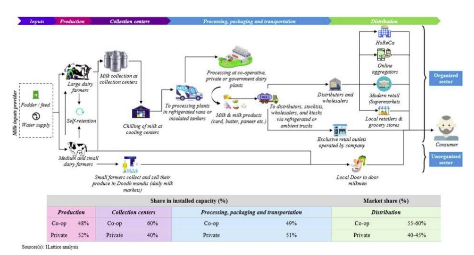In India, every litre begins its journey on a farm that may milk anywhere between two cows or several thousand buffaloes. Roughly 65% of that milk still flows through the “informal” channel of local collectors and sweet-shops; the rest is funnelled into organised co-operatives like Amul and private dairies that can certify quality, pay by the milk’s fat-content, and bill the farmer by the end of the day.