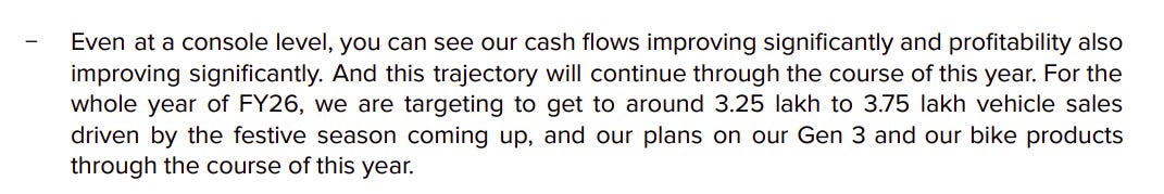 Part of the answer sits in the details Ola didn’t emphasise. Back in July, the company publicly guided for 3.25–3.75 lakh vehicles in FY26, anchored on the festive season and the rollout of its Gen 3 platform.