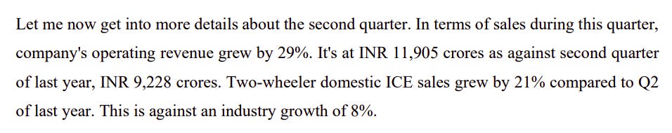 And the divergence doesn’t stop at pure EVs. TVS said domestic ICE two-wheeler sales grew 21% for them, against industry growth of 8%.