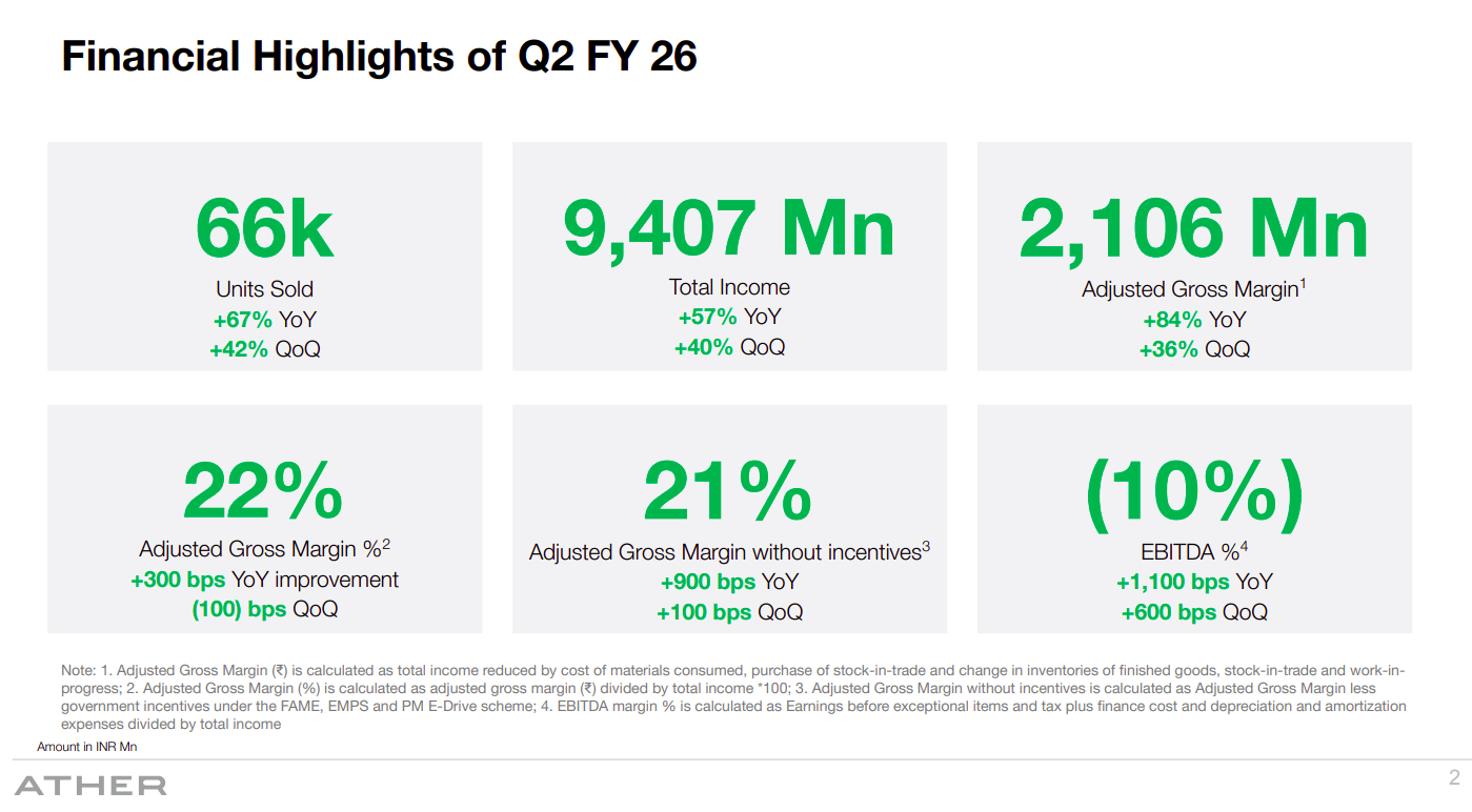 Because in the same quarter, Ola calls the industry flat, Ather described its own performance as one of its strongest ever. They sold around 66,000 vehicles in Q2, a 67% jump year-on-year and 42% quarter-on-quarter. October registrations were nearly 50% higher than last year.