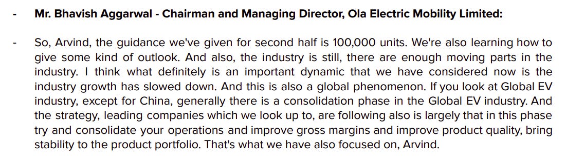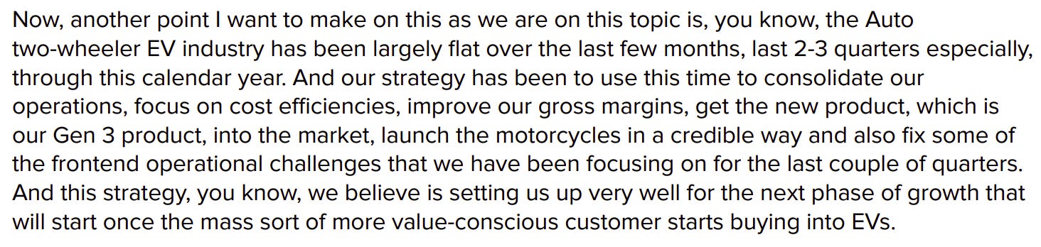 And there’s a missing piece here that the company didn’t highlight directly, but you can see when you compare it with competitor commentary. If Ather is growing 40–60% in multiple markets, and TVS and Bajaj are seeing multi-year highs across premium and scooter categories, then someone’s share is shifting. The simplest reading is also the most likely one: Ola didn’t just see a flat market. It saw its own share being chipped away by competitors who are growing into the space it once dominated. The “industry flatness” line hides that possibility, but doesn’t remove it.