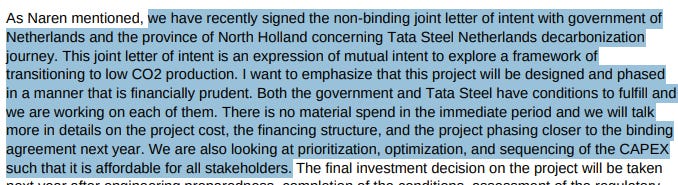 Which makes the nature of Tata Steel’s quote interesting. They say they have signed a letter of intent with the government of the Netherlands, and earlier, they also indicated their confidence that they’ll do it on time: