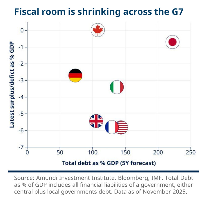 Japan is the outlier. Even as the Bank of Japan begins gently raising rates, the government is shifting toward a more supportive fiscal stance under new political leadership. In other words, Japan is leaning into fiscal expansion at the same time its monetary policy is slowly tightening, which is the opposite of most other G7 economies.