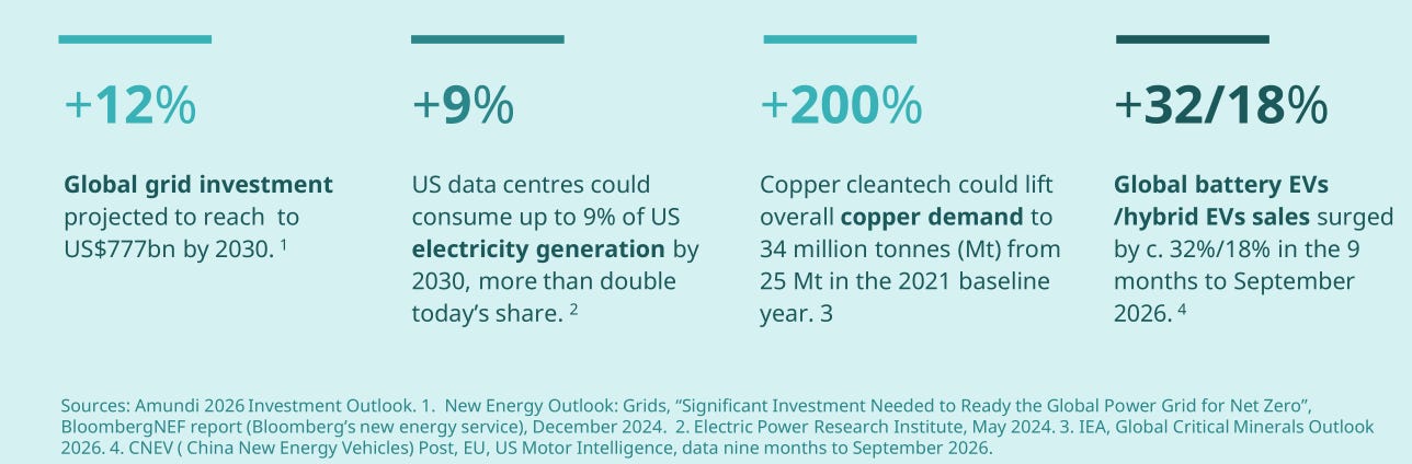 Amundi looks at the problem from another angle, which is the grid itself. In many advanced economies, about 40% of the grid is over twenty years old and these networks were never designed for the combination we now have with rising data center loads, industrial electrification, and mass EV charging. Amundi points to research showing that updating these systems will take hundreds of billions of dollars over the next decade.