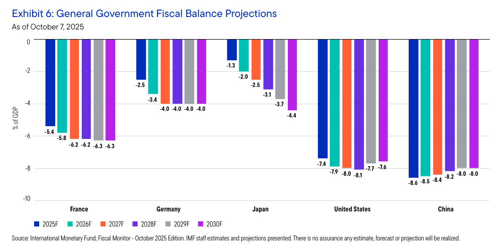 Franklin Templeton’s 2026 outlook says that we are now living in “an era of big and intrusive government.” This is most clear in the growing budget deficits of major economies. According to IMF data, economies like the United States will have a fiscal deficit of –7.9% of GDP in 2026, China will have a deficit of –8.5%, Germany will have a deficit of –3.4%, and Japan will have a deficit of –2.0%.