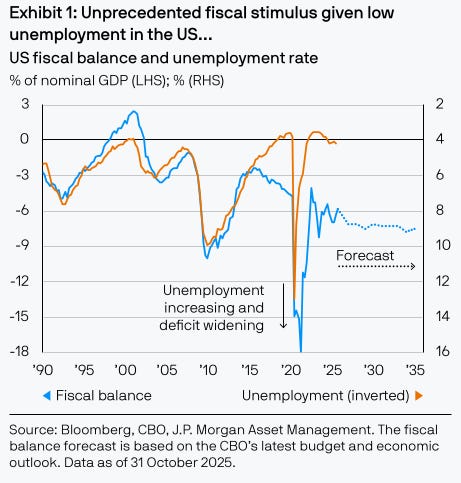 Taken together with J.P. Morgan’s point, this creates a rare combination: the US is running a fiscally expansionary policy without being in a recession, something that has almost no historical precedent.