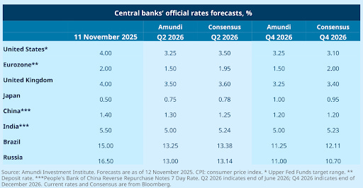 Amundi thinks that by the end of 2026, the Fed funds rate will be 3.25%, the ECB deposit rate will be 1.50%, the Bank of England’s rate will be 3.25%, the Bank of Japan’s rate will be around 1.0%, the PBoC’s 7-day rate will be around 1.20%, and the RBI’s rate will be around 5.0%.