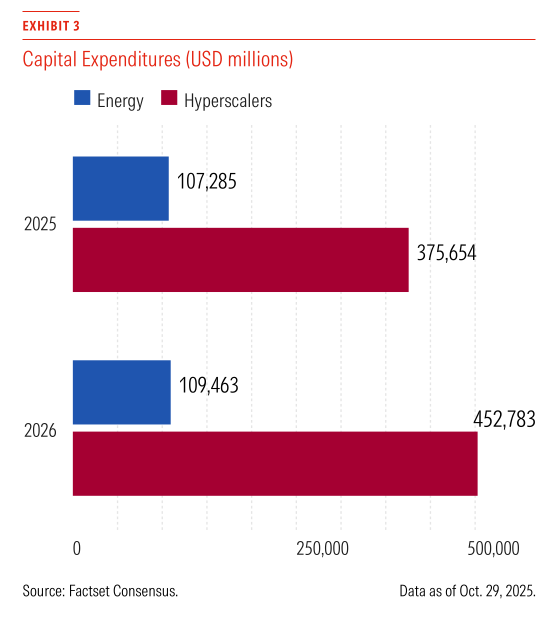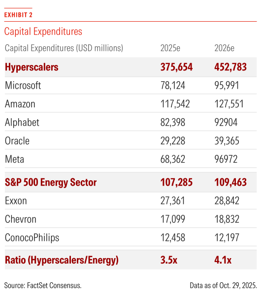 You see the same pattern in other reports, too. Morningstar’s global outlook highlights just how large the AI build-out has become. Most of the capital spending by hyperscalers—the big cloud and AI players like Amazon, Microsoft, Google, and Meta—is climbing sharply from 2025 to 2026. The scale is striking: by their estimates, hyperscaler capex will be more than four times what the entire US energy sector is expected to spend. Goldman Sachs doesn’t give a precise GDP contribution, but this is exactly the kind of spending they have in mind when they describe data center construction as a central pillar of the US investment cycle heading into 2026.