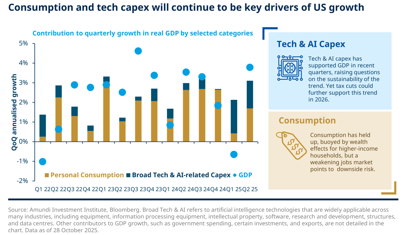 All this infrastructure spending isn’t just putting pressure on the system; the charts show that it has already become a major driver of economic activity. One of the clearest examples comes from Amundi’s 2026 Outlook. Technology and AI-linked investment are adding more to US growth than household consumption. Investment has stayed strong even as consumption has cooled, and that widening gap is a big part of why the US economy hasn’t lost momentum.