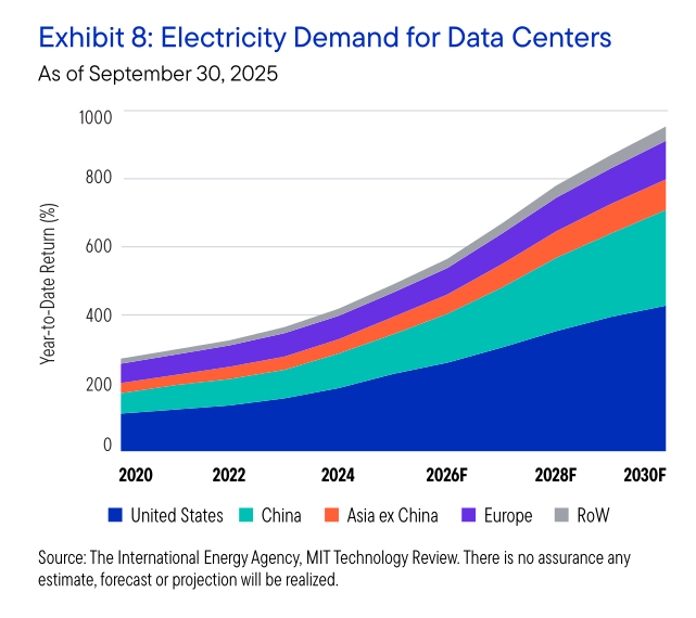 Franklin Templeton’s long-term outlook includes a chart showing data center electricity consumption rising steeply through the decade. Their point is simple: the first leg of the AI boom rewarded chipmakers and big platforms, but the next leg is going to hit a very real limit—electricity.