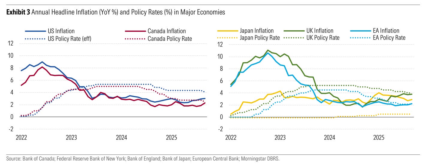 The first thing that Morningstar says in its 2026 outlook is that the global economy “weathered the trade policy-induced shock relatively well.” Their predictions say that growth in 2026 will be “reasonably strong,” with inflation falling in most advanced and emerging economies.