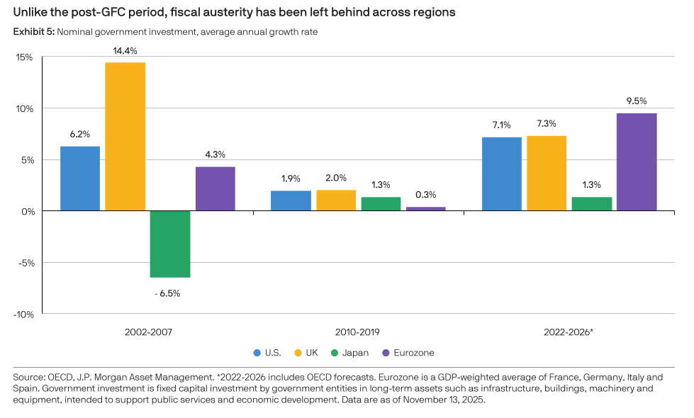 One important consequence is competition for money. When governments run large and lasting deficits, they compete directly with the private sector for savings. That includes investment in AI, data centers, energy infrastructure, and the climate transition. This makes it harder for interest rates to fall in a meaningful way. Higher real interest rates start to look less like a short-term phase and more like something that could last through the decade. And that raises the bar for returns across markets while putting pressure on valuations if profits don’t grow fast enough.