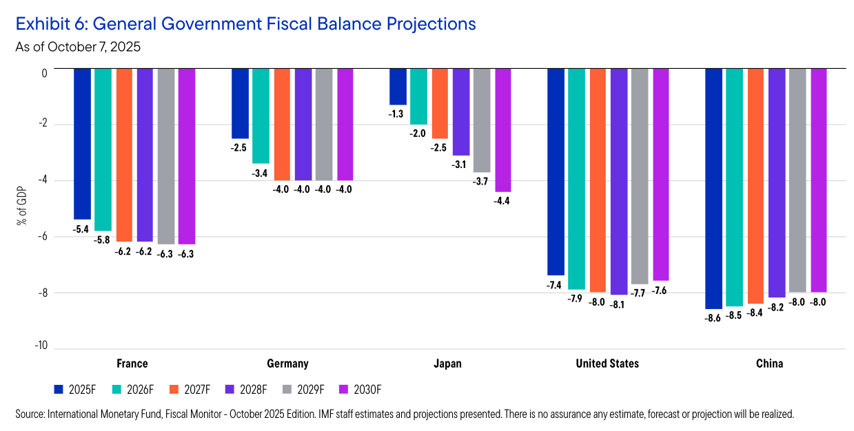 Franklin Templeton describes this shift as the start of an “era of big government,” as we touched on in part 1. The old belief in small government, tight budgets, and strict discipline has been fading ever since the global financial crisis. Today, governments are playing a much bigger role in trade policy, industrial strategy, defense, the energy transition, and social support. Their charts show large and ongoing deficits across the US, Western Europe, China, and possibly Japan, with only a small group of emerging markets moving the other way.