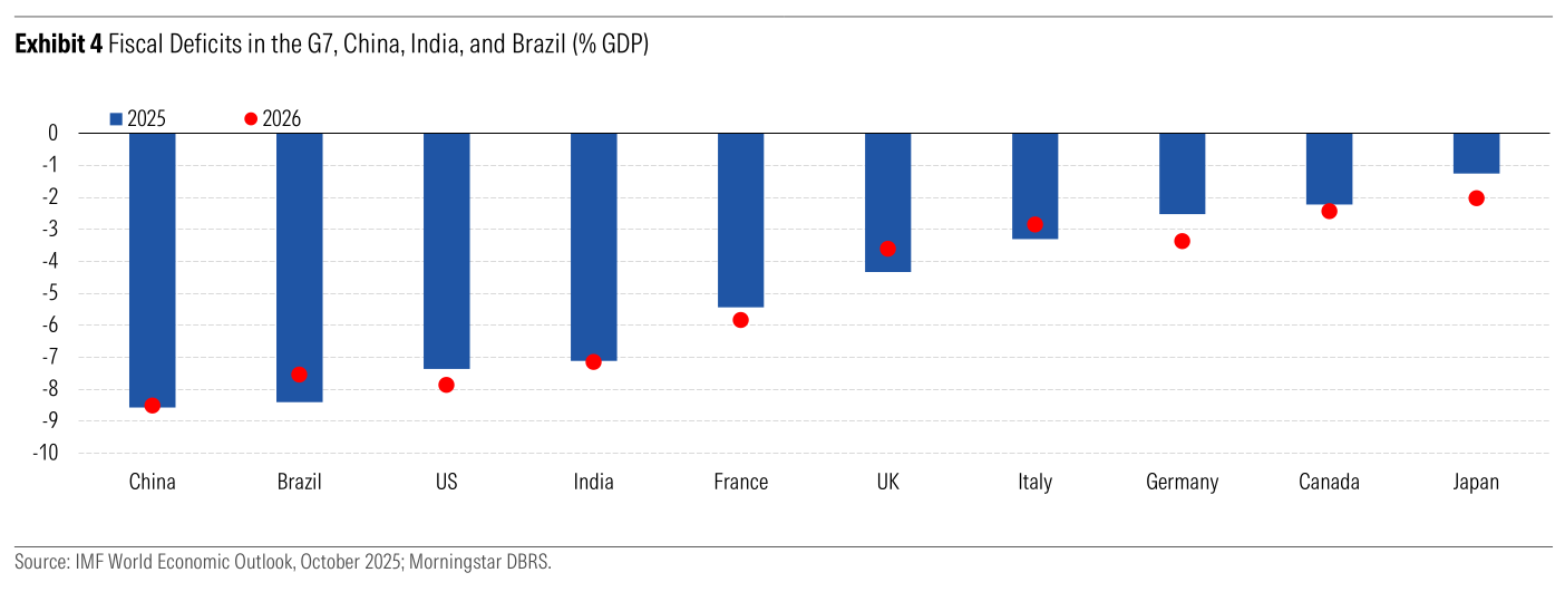 Government finances are already stretched in most big economies, and many are likely to get worse in 2026. As per Morningstar, budget deficits across the G7, China, India, and Brazil are staying firmly in the red through 2025 and 2026. The reasons are well known, but they’re all hitting at the same time: slower long-term growth, aging populations that push up pension and healthcare costs, higher welfare spending, bigger defense budgets, and rising interest bills as old debt is refinanced at higher rates.