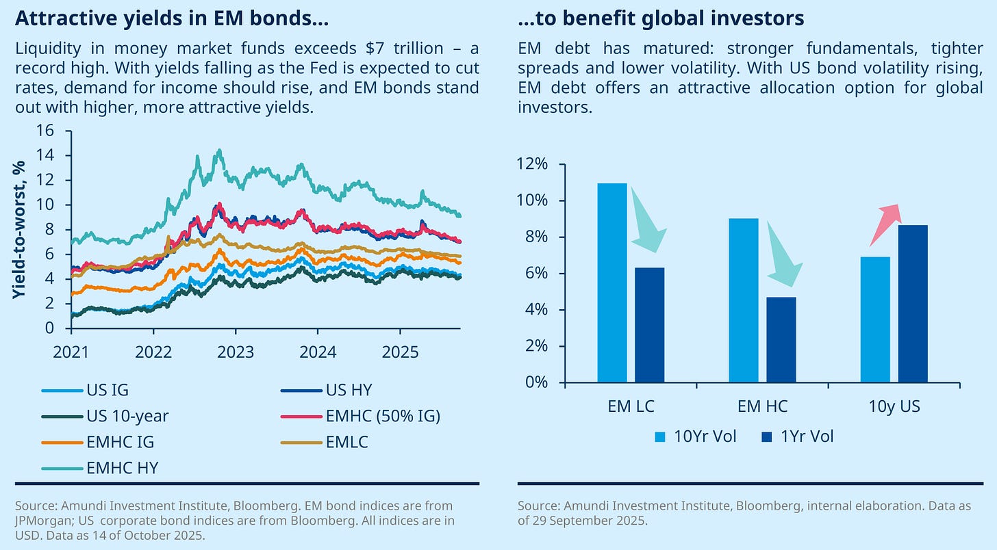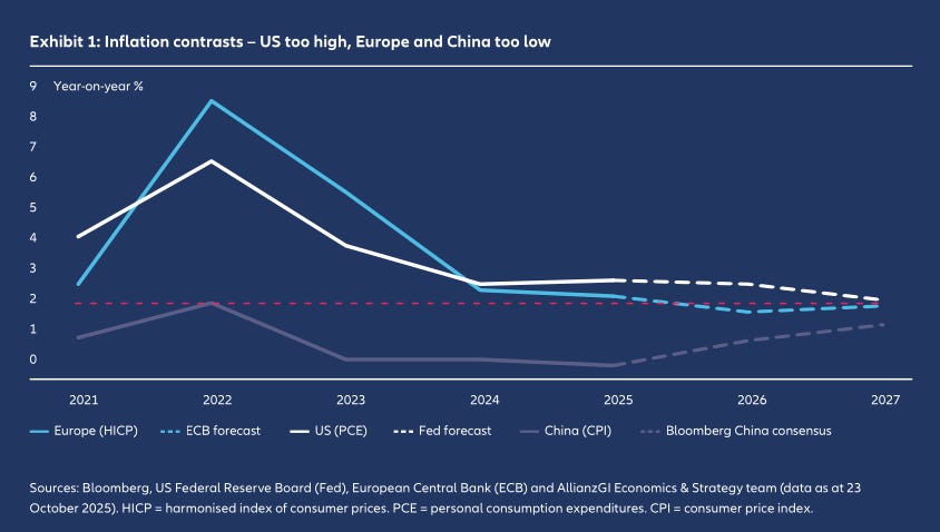 Allianz points out that many emerging markets, especially in Asia, are in better shape than in past cycles. Inflation is lower, interest rates are positive in real terms, debt maturities are longer, and more borrowing is done in local currencies. That makes them less vulnerable than during episodes like the 2013 taper tantrum.