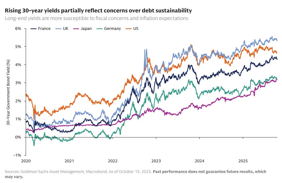 Goldman Sachs adds some perspective on scale and market reaction. Global government debt has now crossed $100 trillion. In the US, deficits are unusually large given how strong the economy still is, with debt levels close to post-war highs. Goldman also points to France as a warning sign. Political uncertainty there has pushed 10-year bond yields close to Italian levels, showing how quickly markets can lose patience when fiscal worries meet political instability.