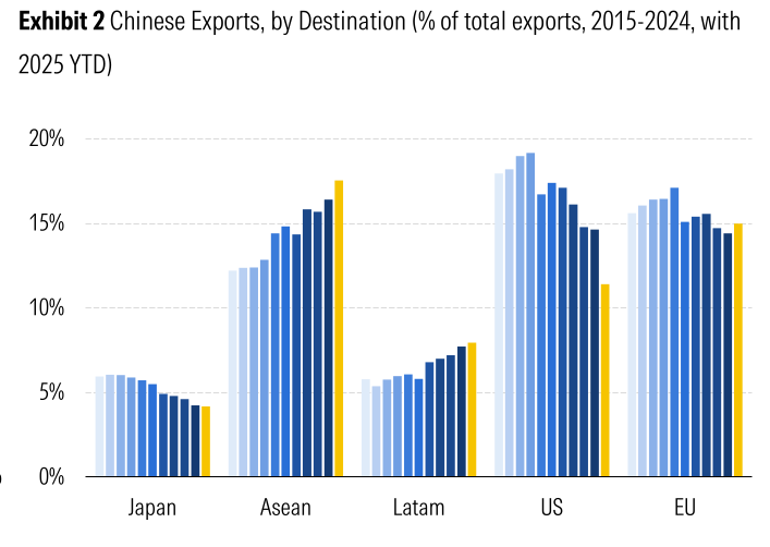 Southeast Asia has absorbed a large part of it. The share of ASEAN countries has risen from roughly 12–13% in 2015 to around 17–18% today, making the region China’s largest export destination. Latin America has also taken a bigger share, climbing from about 5–6% to nearly 8%. Europe, meanwhile, has stayed broadly stable. In simple terms, the US–China trade route is narrowing, but China is still exporting at scale—just through different paths.