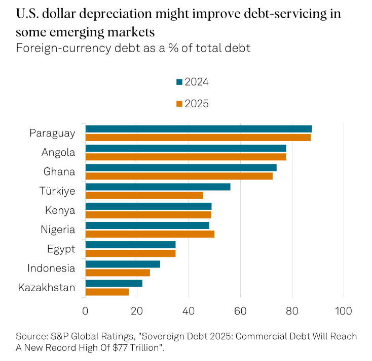 For emerging markets, the direction of the US dollar matters a lot. S&P shows that a weaker dollar can make it easier for countries to service debt that’s been borrowed in dollars. That alone can improve financial stability.