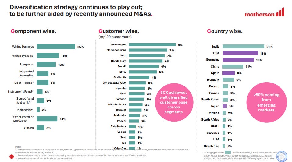 In our primer, we mentioned how auto ancillaries are attempting to diversify across automakers, geographies, and even industries — entering defence, healthcare, and so on. Given how sticky and unprofitable this business is, diversification becomes a method of building resilience. The largest players, like Motherson, understand this well, and that reflects in their business.