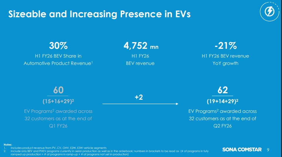 Take Sona Comstar, for instance. Originally a transmission gear and axle maker for ICE vehicles, it pivoted to driveline products specific for EVs, like e-axles, motor shafts and hub motors. It now derives ~30% of revenue from battery-EV vehicles and supplies EV makers globally. Sona even engineered a ferrite-based motor that avoids scarce rare-earth magnets — an important innovation considering China’s iron-hand grip on rare earths.