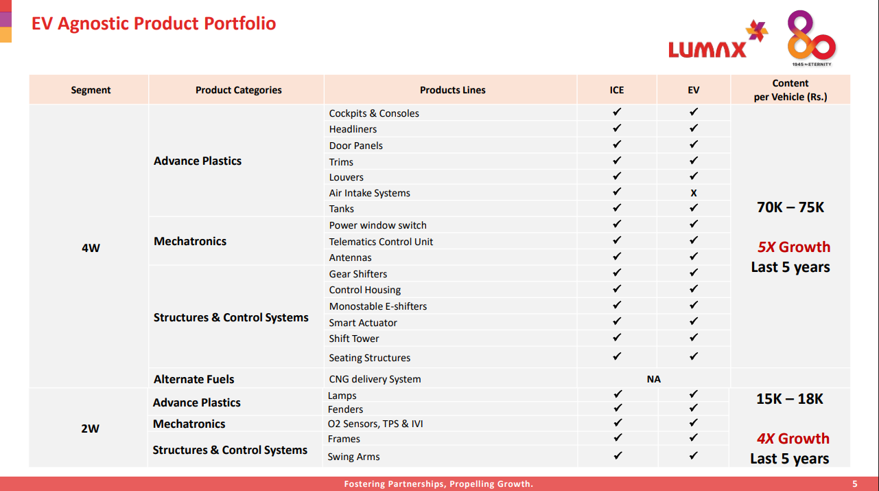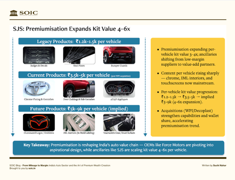 For instance, SJS Enterprises, for instance, has quadrupled its content per car from ₹1,200 to ₹3,500. Lumax Auto, meanwhile, went from being a mere plastic assembler to now designing whole cockpits for Mahindra. Uno Minda, meanwhile, has moved from simple ₹500 halogen bulbs to complex LED setups worth over ₹10,000.