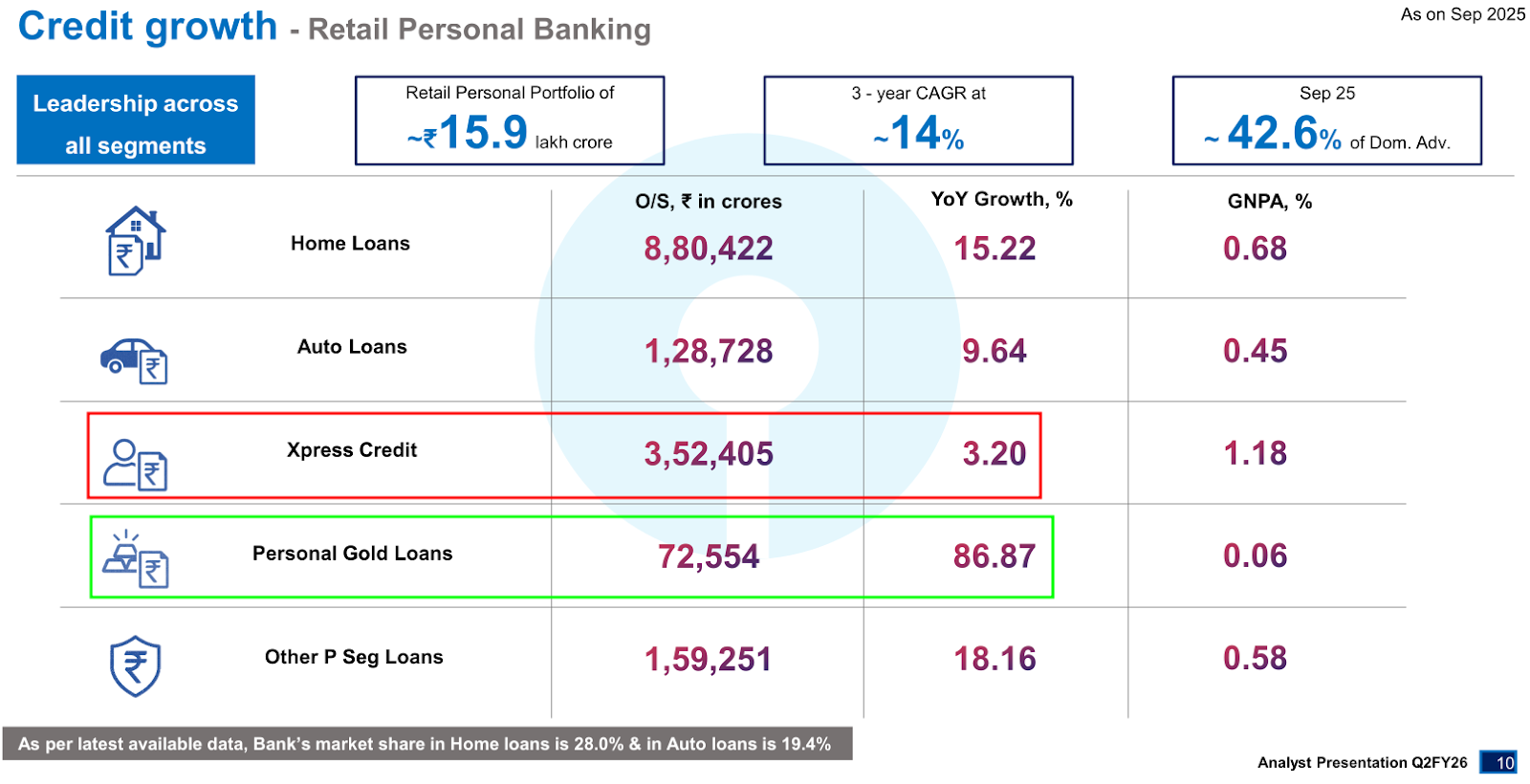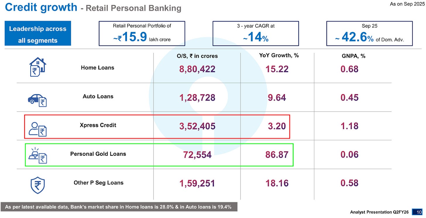 And at the same time, they’ve been more cautious on unsecured PLs because of RBI’s stance. Put the pieces together, and the direction is identical to SBI’s — even if we can’t quantify gold vs. personal loans from the slides.