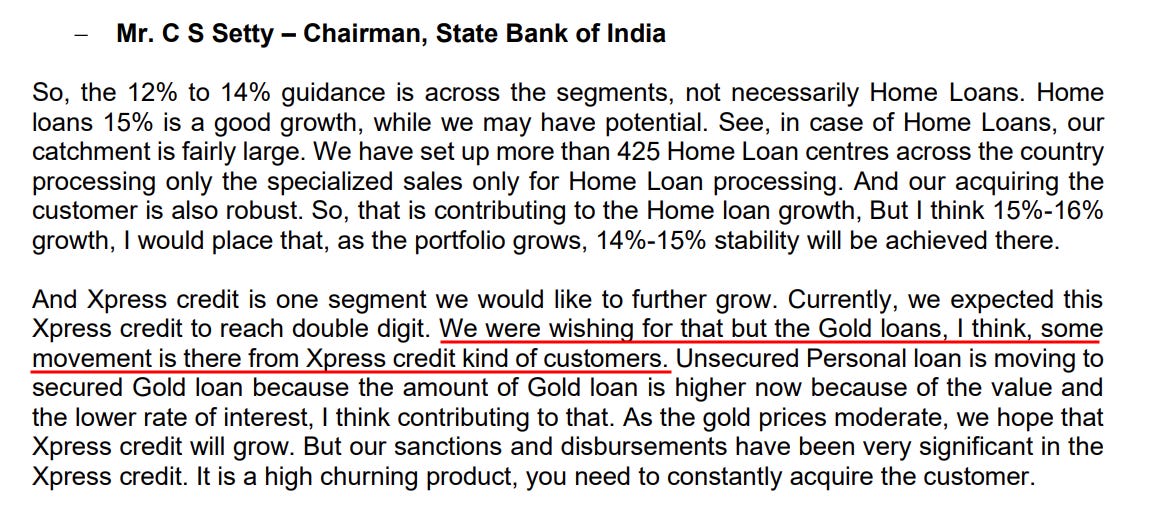 For the past couple of quarters, SBI has been showing confidence in returning to double-digit growth for its Xpress Credit portfolio. They were attributing a slowdown to a deliberate technology revamp, back in Feb 2025 and May 2025 concall.
