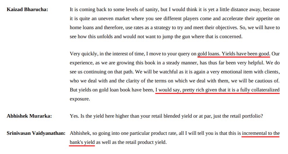 They said gold loans have been growing 5–6% every quarter and yield “pretty rich” returns — without the risk profile of unsecured loans.