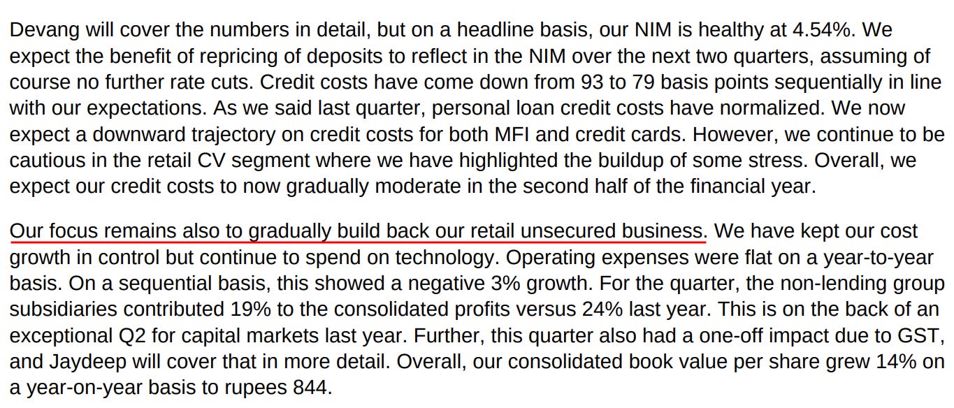 Kotak is the most transparent about its strategy. Unsecured book is down to 9.2% of the loan book. They are “gradually building back” unsecured after slowing it while the most growth is “mainly in secured business”