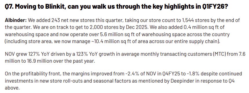 If Reliance is leaning on scale and cash, Blinkit is leaning into precision. They added 243 net new stores in the June quarter alone, taking their total to 1,544. They’re on track to hit 2,000 by the end of the year.