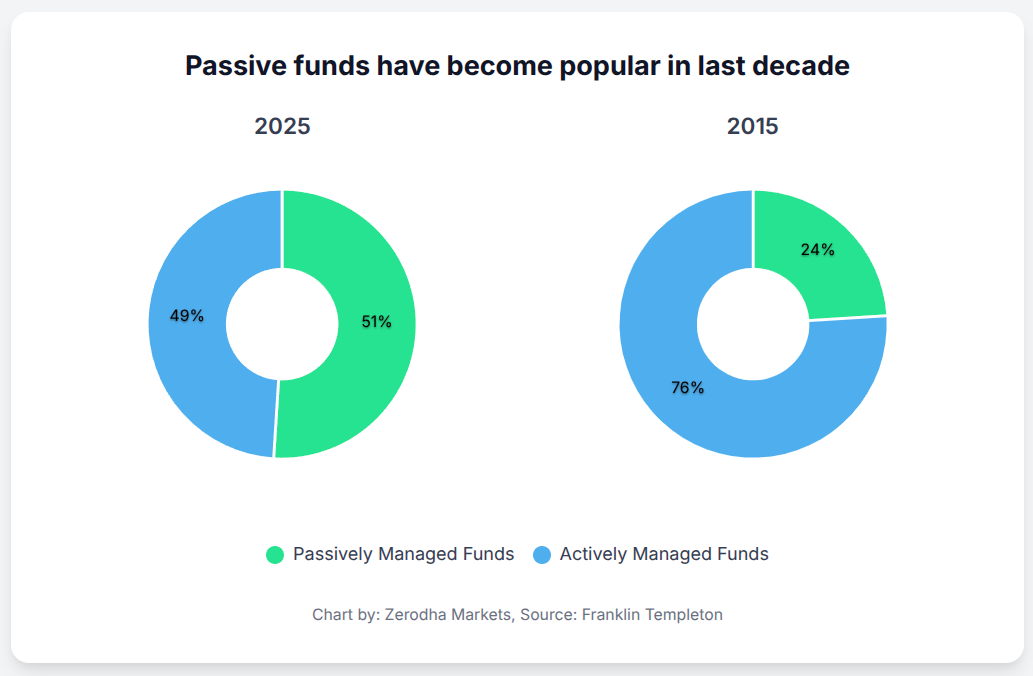 By 2025, that picture has flipped. Passive funds now hold the majority at 51%, while active funds have slipped to 49%. The big drivers have been lower costs, easier access through ETFs, and the fact that most active funds have struggled to consistently beat the market. It’s one of the most significant shifts in modern finance.