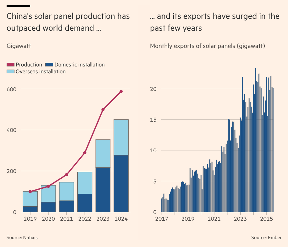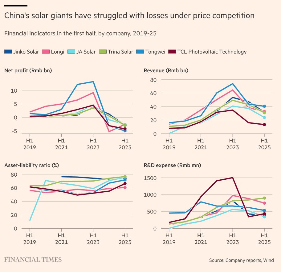 But a recent Financial Times article shows the industry is now facing a severe crisis. In the first half of 2025 alone, six of China’s biggest solar companies lost a combined RMB 20.2 billion, or about $2.8 billion, more than double their losses from a year earlier.