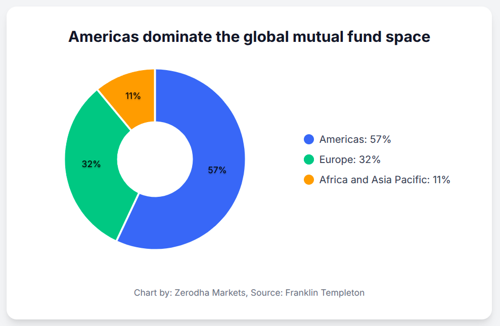 The Americas account for about 57% of global mutual fund assets. Europe is far behind at 32%, and the entire Africa and Asia-Pacific region combined makes up just 11%.