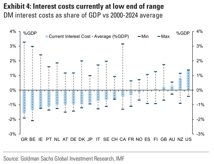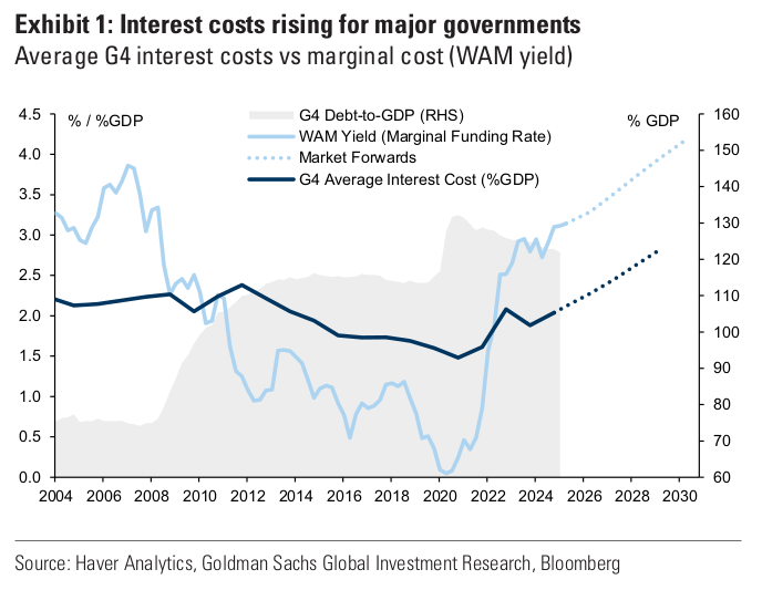 A Goldman Sachs report shows just how serious this has become. Even though central banks have started cutting rates from their highs, the interest burden on major economies is still rising.