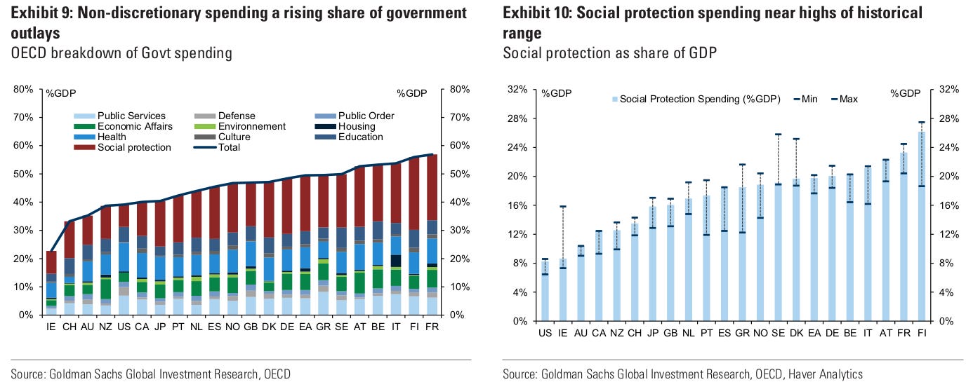 The Goldman Sachs report points out that spending on social protection and healthcare is already near the top of historical ranges, which makes cutting back politically difficult. At the same time, defense budgets are also climbing across much of Europe.