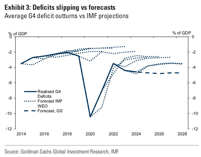But that cushion is fading as older bonds mature and are refinanced at higher rates. Since the pandemic, budget deficits in the US, UK, and Europe have regularly ended up larger than initial projections.
