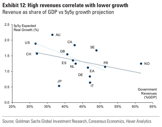 To bring budgets under control, governments face a tough choice: raise taxes or cut public services. But higher taxes aren’t a simple fix either. In much of Europe, revenues are already above their historical average as a share of GDP. And Goldman notes that higher tax-to-GDP ratios often go hand in hand with slower growth.