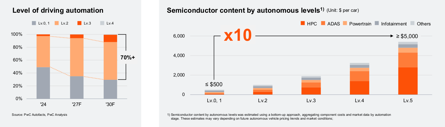 The second big growth driver is autos. With electric vehicles, autonomous driving, and software-defined cars, vehicles now use more chips than ever before. To put that in perspective, a basic Level 0 or Level 1 car—meaning no or minimal self-driving features has less than $500 worth of semiconductors. But a fully autonomous Level 5 car, capable of driving itself in all conditions, could pack in more than $5,000 worth.