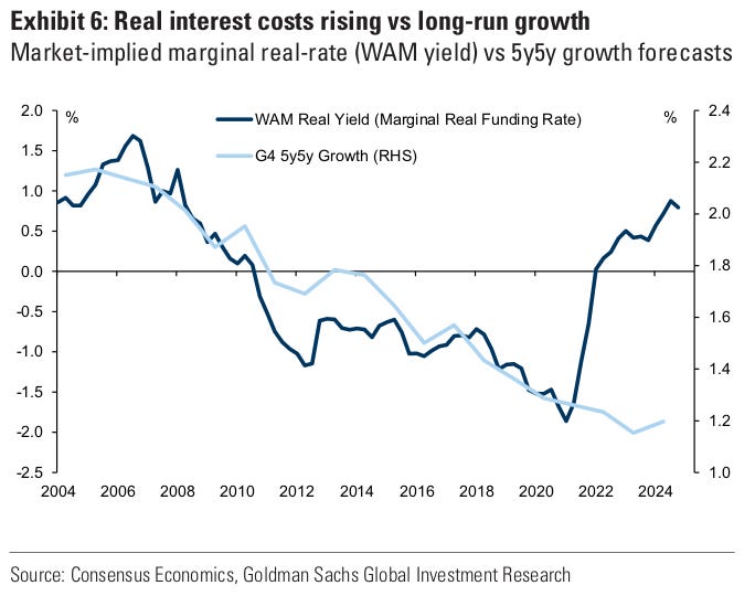 Another big question is whether real interest rates rise faster than real growth. If the cost of borrowing ends up higher than the growth rate, managing debt becomes much harder.