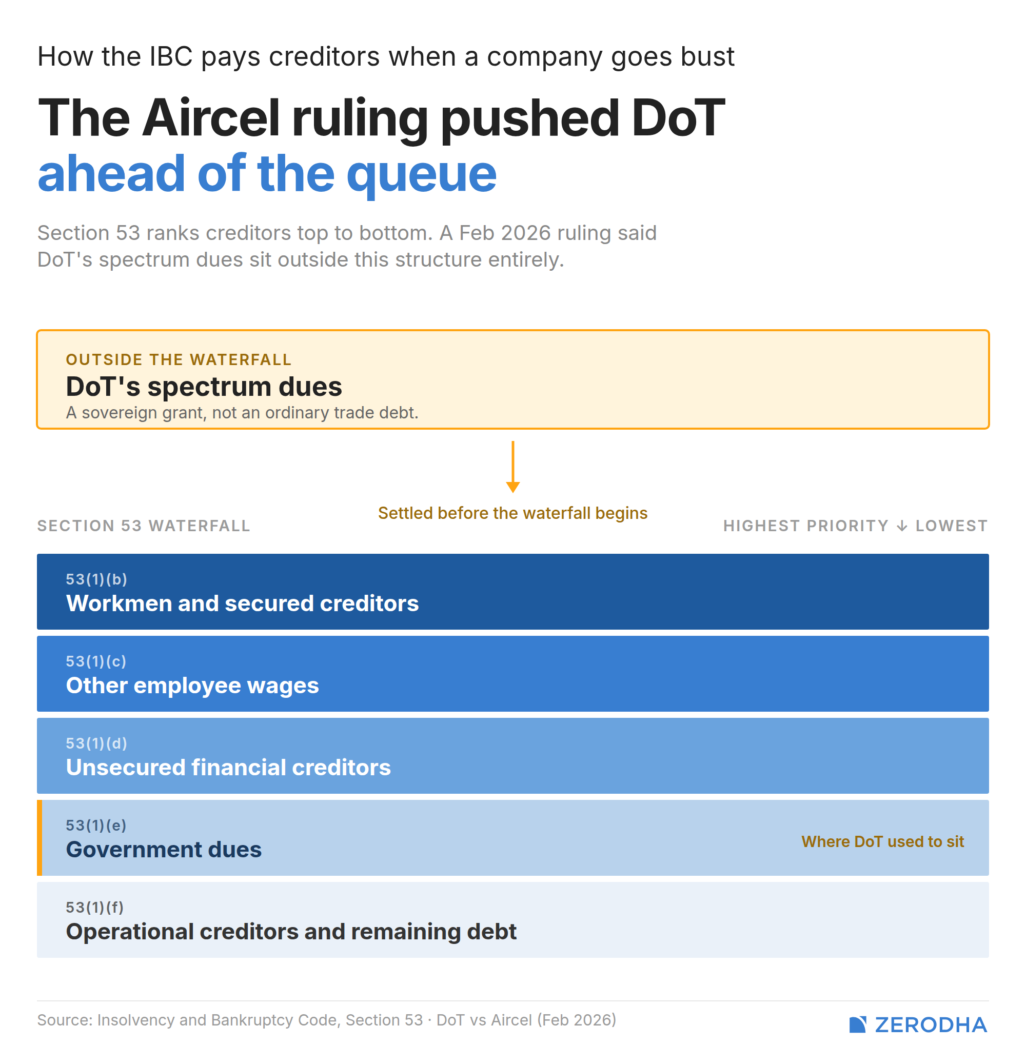 In telecom bankruptcies, DoT is typically the single largest creditor in the room. The court itself noted that failed telcos collectively owe the government around ~₹39,000 crore. If every rupee of that has to be paid first, before banks touch anything, most telecom resolutions stop making arithmetic sense for the long line that’s waiting for their turn.