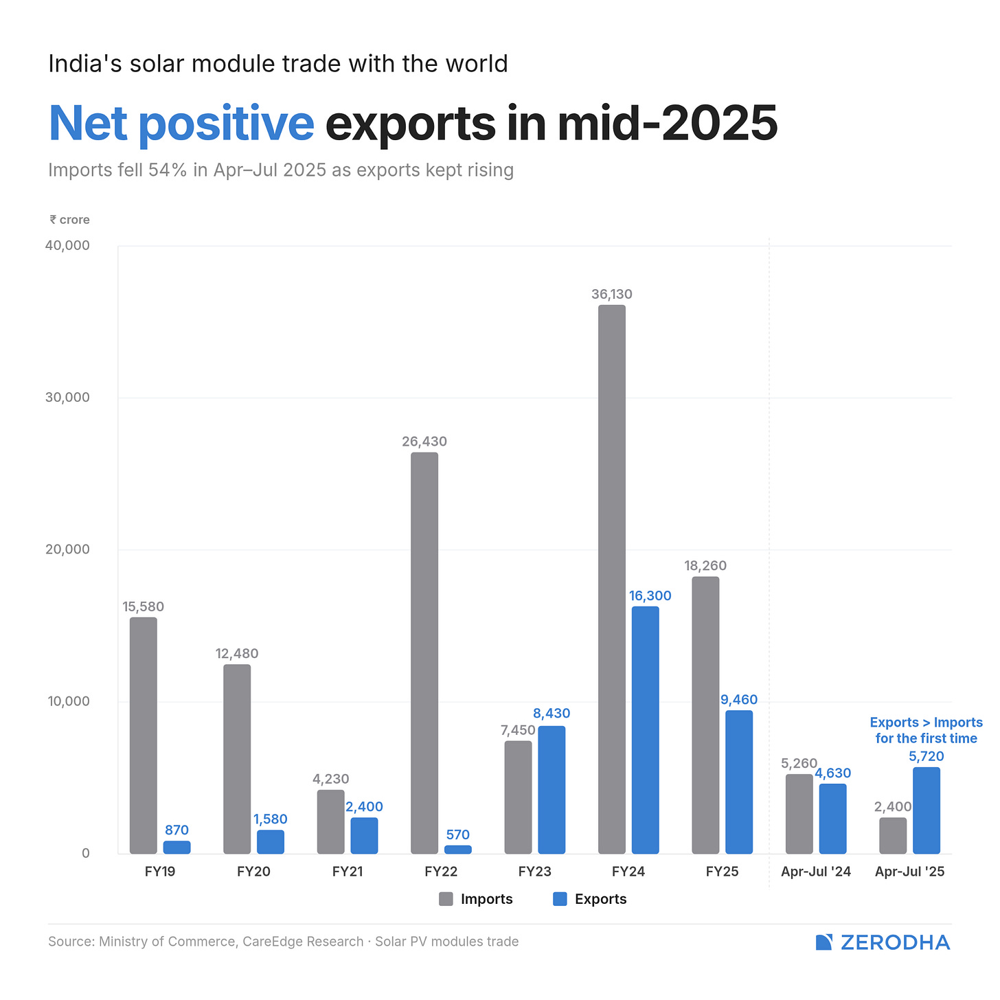 India’s export performance tells this story more honestly than the headline capacity numbers do. Solar equipment exports have picked up, mostly in modules, and mostly to the United States, which made up a whopping 97% of India’s solar exports. But the US isn’t buying Indian because Indian products are higher quality. Washington has erected its own barriers against Chinese solar equipment through anti-dumping duties. In that case, India is mostly a beneficiary of American geopolitical anxiety rather than global competitiveness.